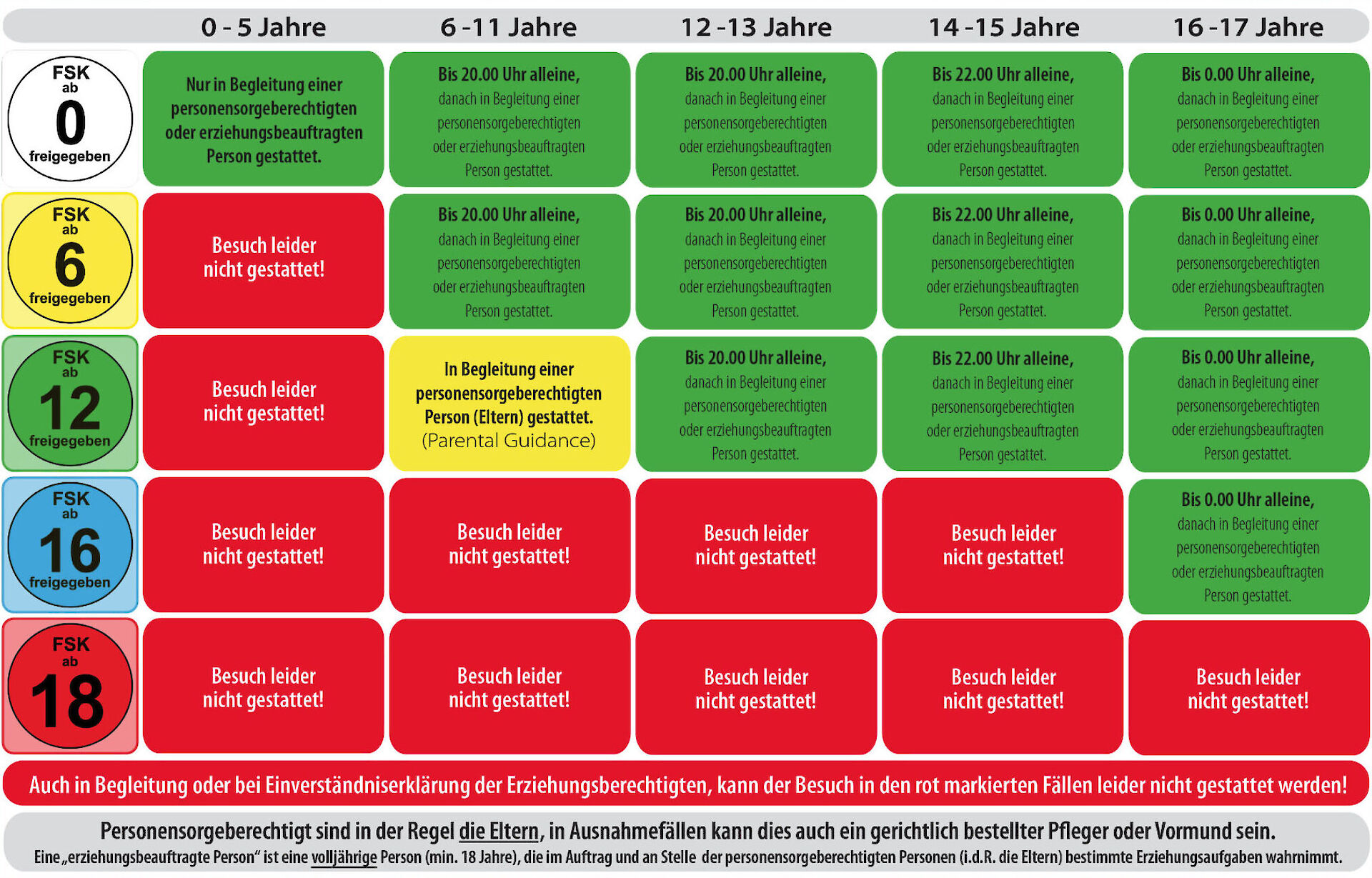 Liebe Eltern, wir halten uns nach bestem Wissen und Gewissen an die Jugenschutzbestimmungen. Hierfür benötigen wir aber auch Ihre Mithilfe! Wirken Sie wohlwollend auf Ihre Kinder ein, indem Sie ihnen erklären, warum bestimmte Filme noch nicht geeignet sind. Manchmal ist nicht sofort erkennbar, warum ein Film noch nicht geeignet ist. Bei Filmen ab 16 oder 18 Jahren sollte Ihr Kind einen Personalausweis mitführen.